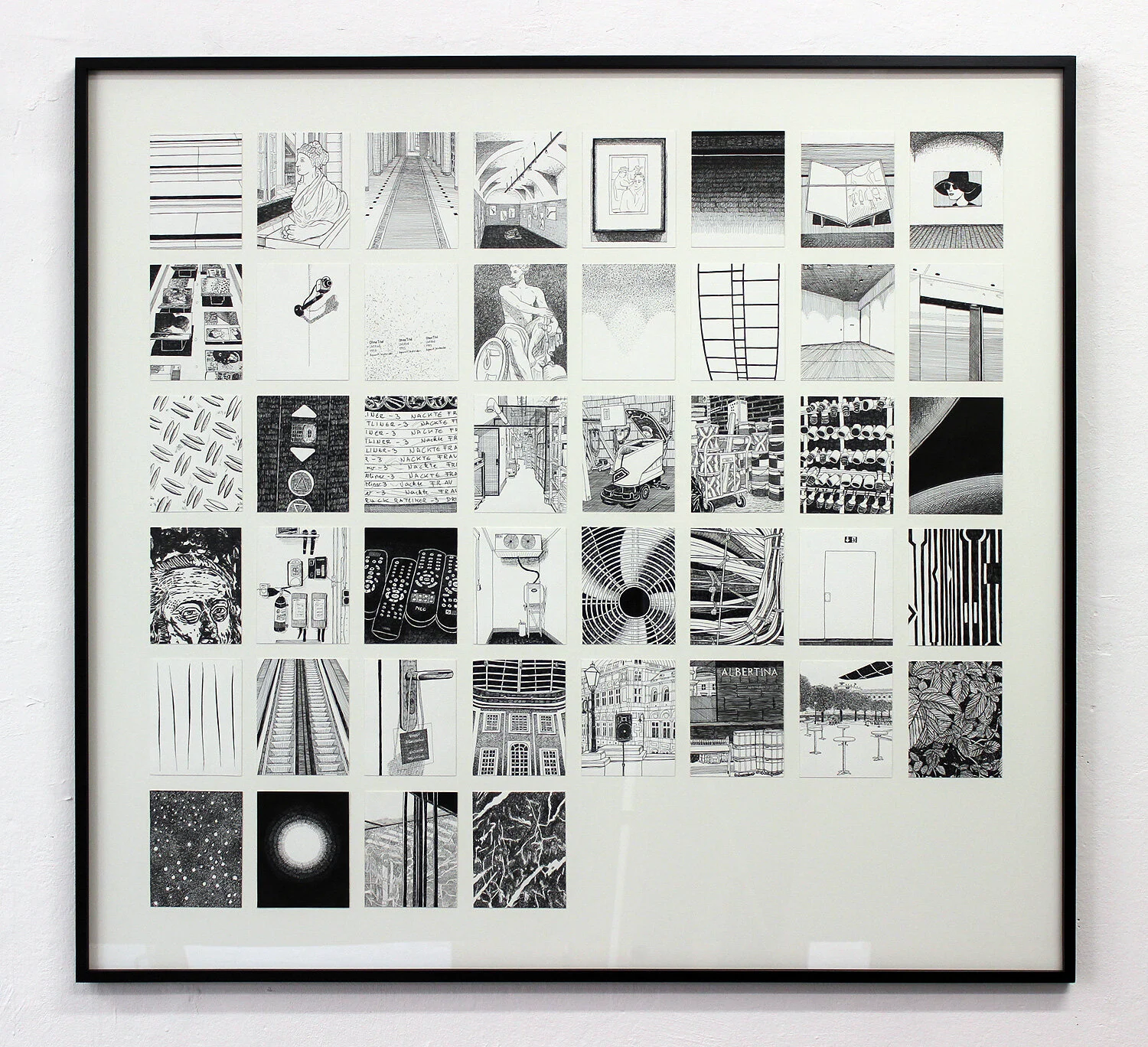 The series light and black consists of 176 small ink drawings on paper, 15 x 12 cm each. They are framed in four “paragraphs” à 44 pieces each. In this series, drawing is used as a medium of visual reporting, in the sense of a drawing that brings something back. It illustrates a lonely route at night through the Albertina museum and graphic art collection in Vienna, where Moussa Kone worked as a student as a museum's guard, mostly during events at night.